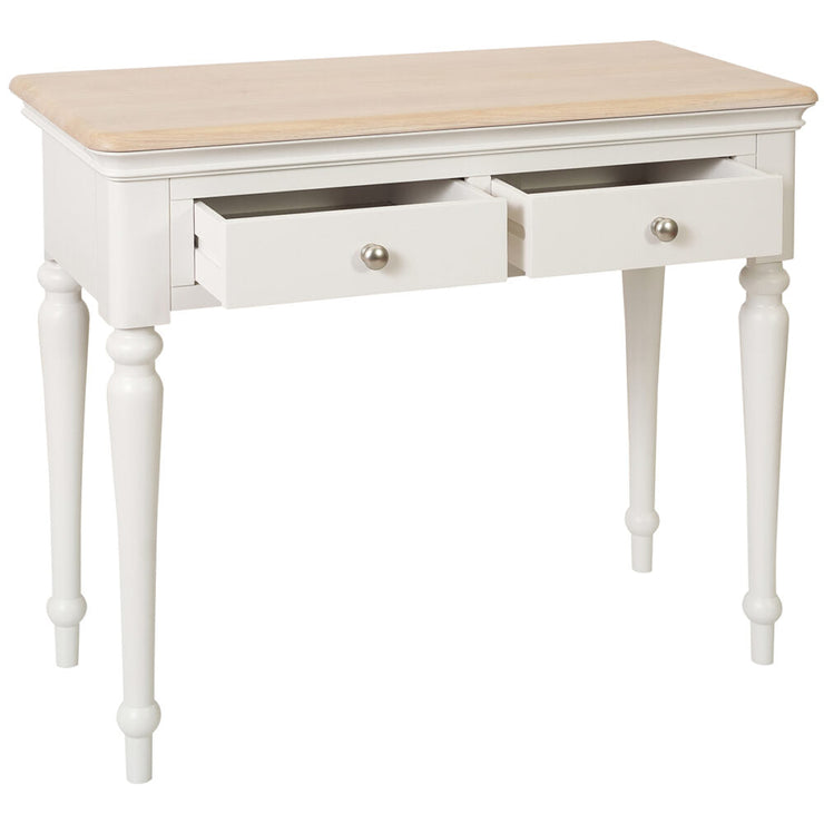 Crafted from White Oak, pine and MDF, it's designed with delicate curves, a light Grey Mist finish, and solid oak tops. With two drawers for storage and a large surface for cosmetics, it also doubles as an office or student desk. Matching vanity mirror and stool available to complete the piece.