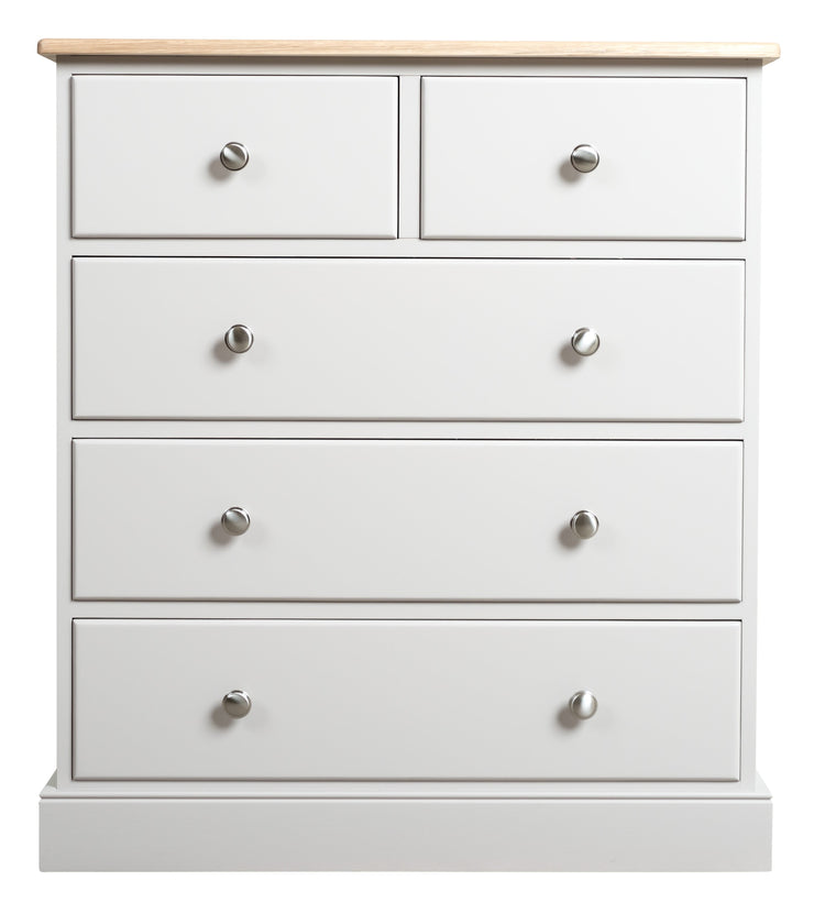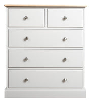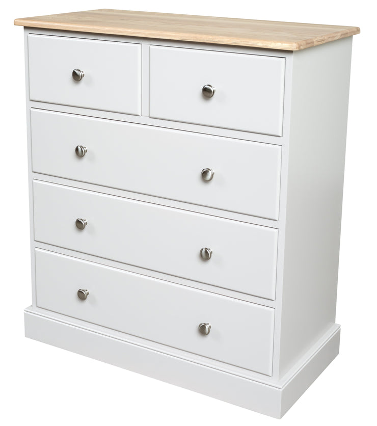 A collection of painted pine bedroom furniture with solid oak tops and knobs.